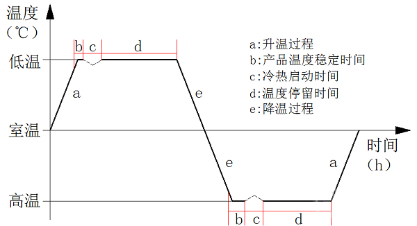 熱循環(huán)試驗是一種利用高低溫交變濕熱試驗箱對試驗產(chǎn)品進行的預(yù)設(shè)高低溫交替的應(yīng)力考核,用以驗證材料和產(chǎn)品是否達到在研發(fā)、設(shè)計、制造中預(yù)期的質(zhì)量目標的一類可靠性試驗。通過大溫變速率可暴露產(chǎn)品潛在的材料與性能缺陷,經(jīng)過不斷地質(zhì)量改進,達到可靠性提升的目的。航天單機類產(chǎn)品一次熱循環(huán)示意圖見下圖1所示。